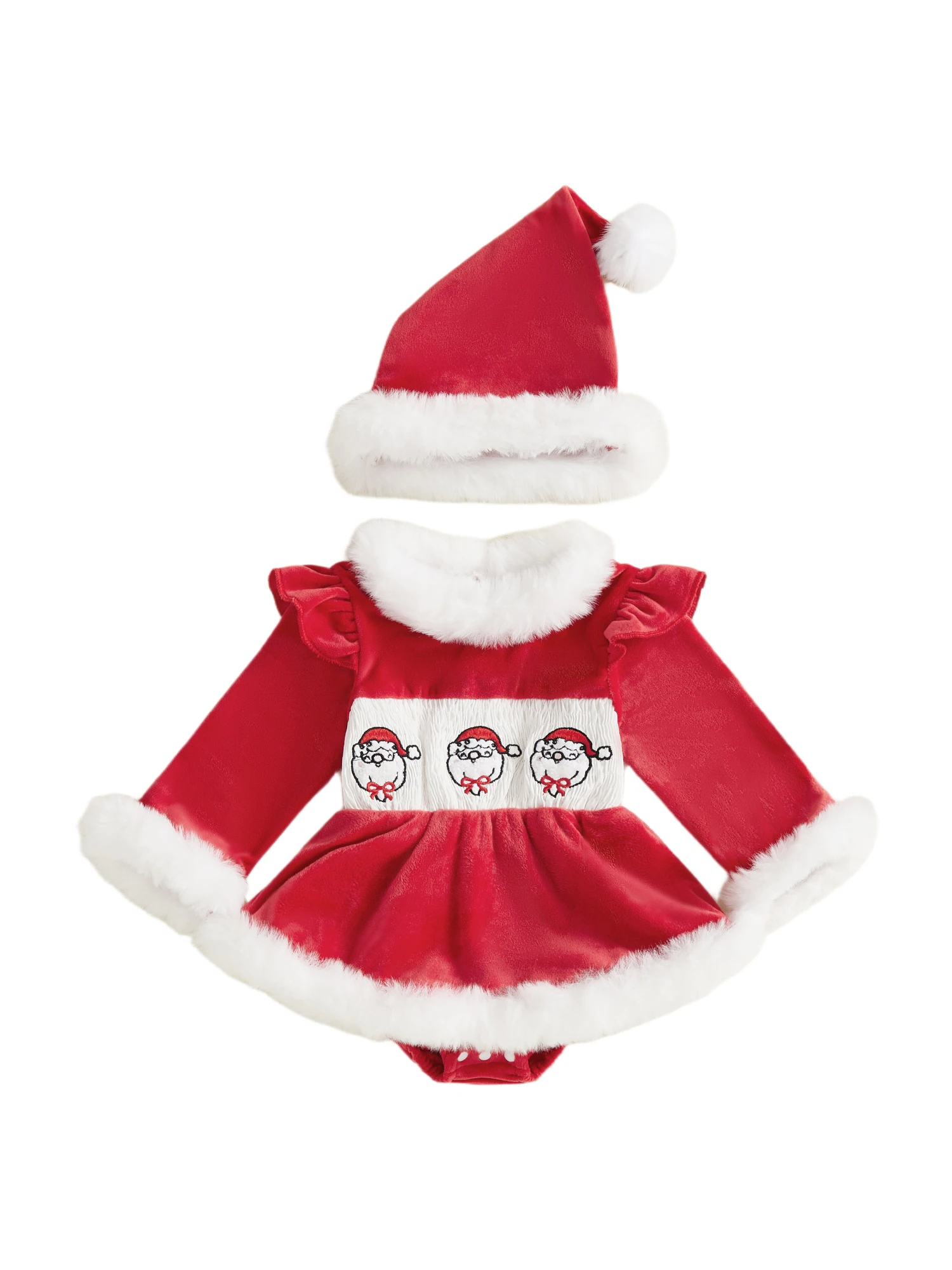 Baby Girl Christmas Outfit Embroidered Furry Trim Crew Neck Long Sleeve Romper Dress and Hat 2 Pcs Set