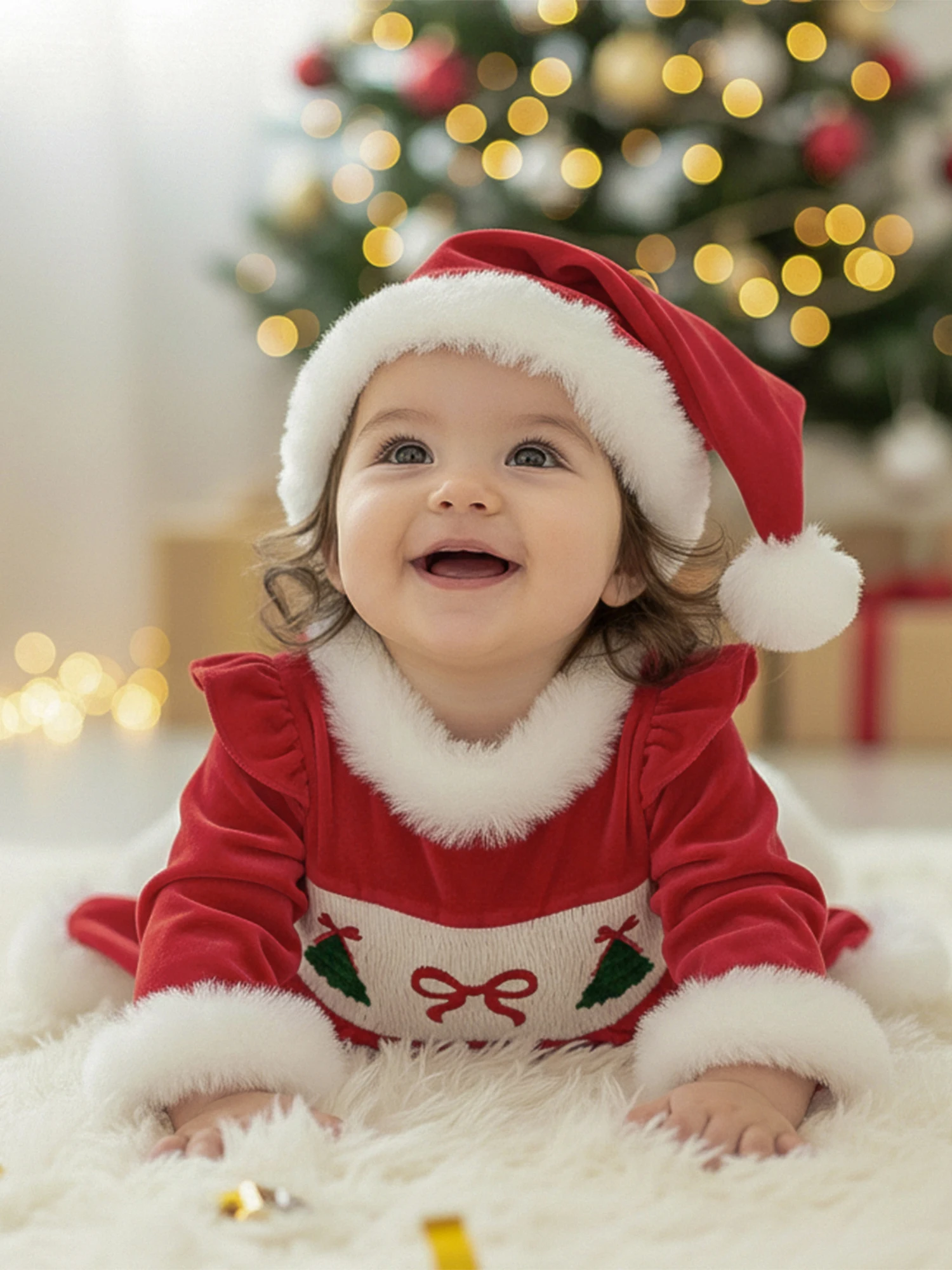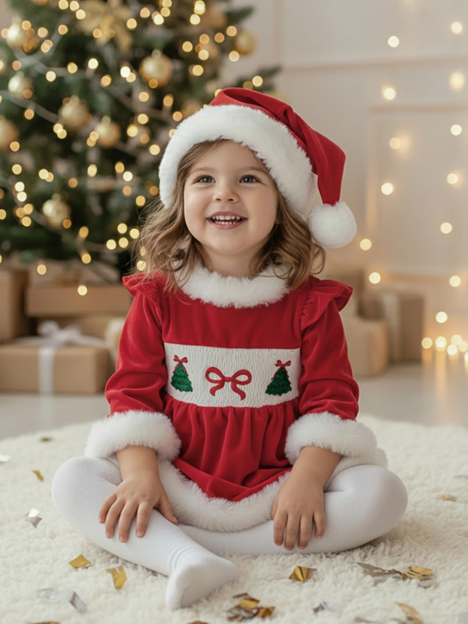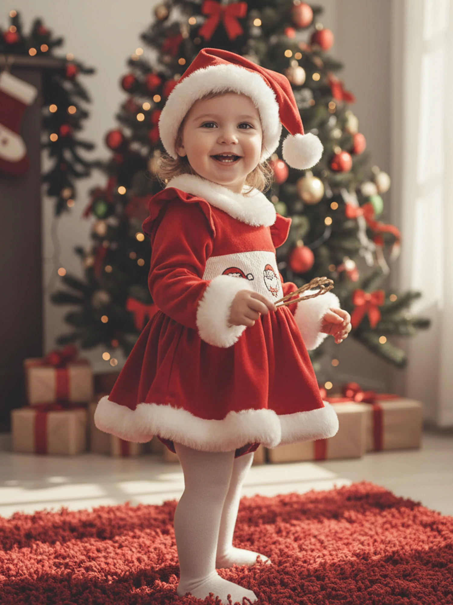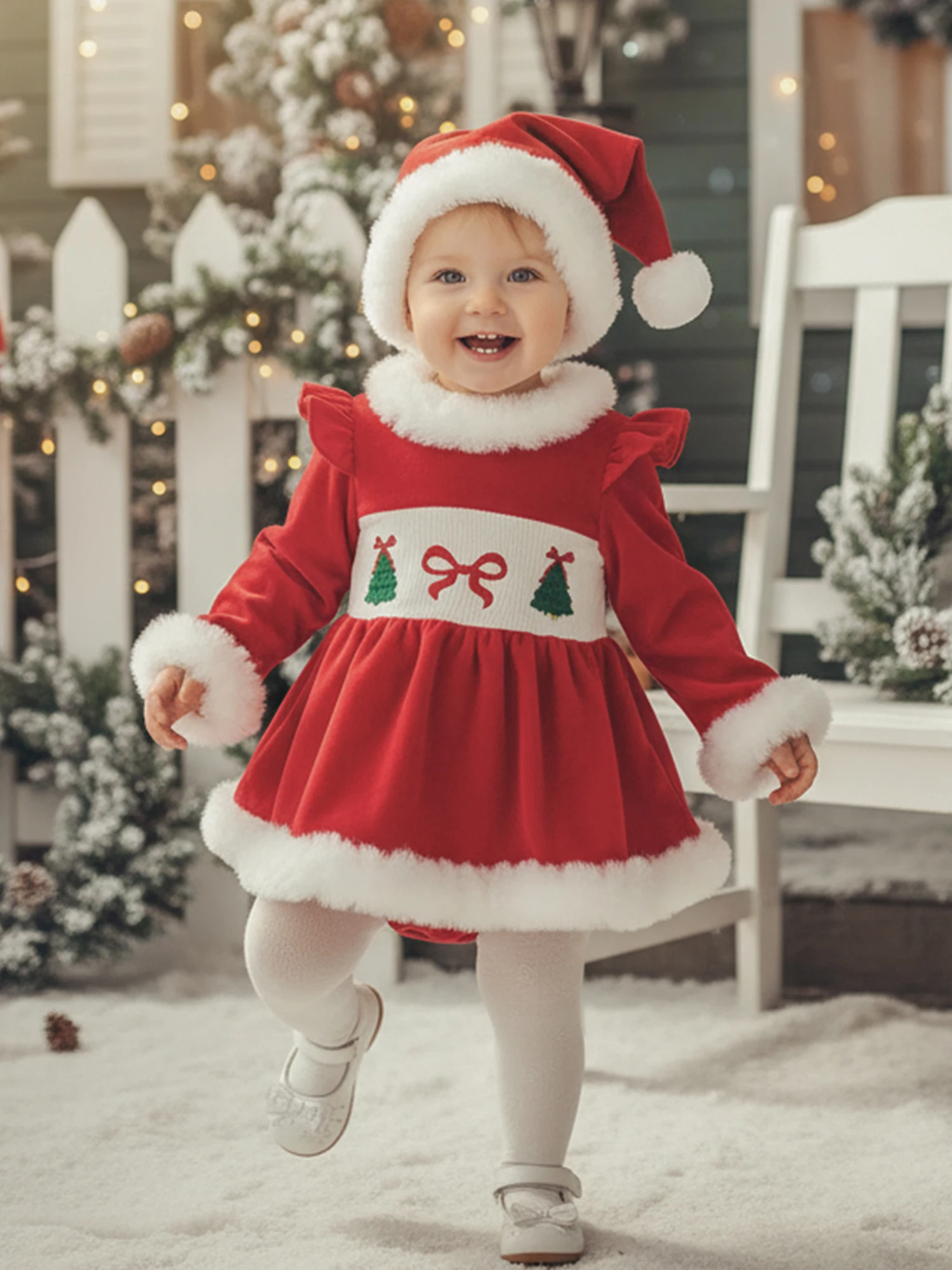2026 New Years Xmas Baby Girl Christmas Outfit Embroidered Furry Trim Crew Neck Long Sleeve Romper Dress and Hat 2 Pcs Set